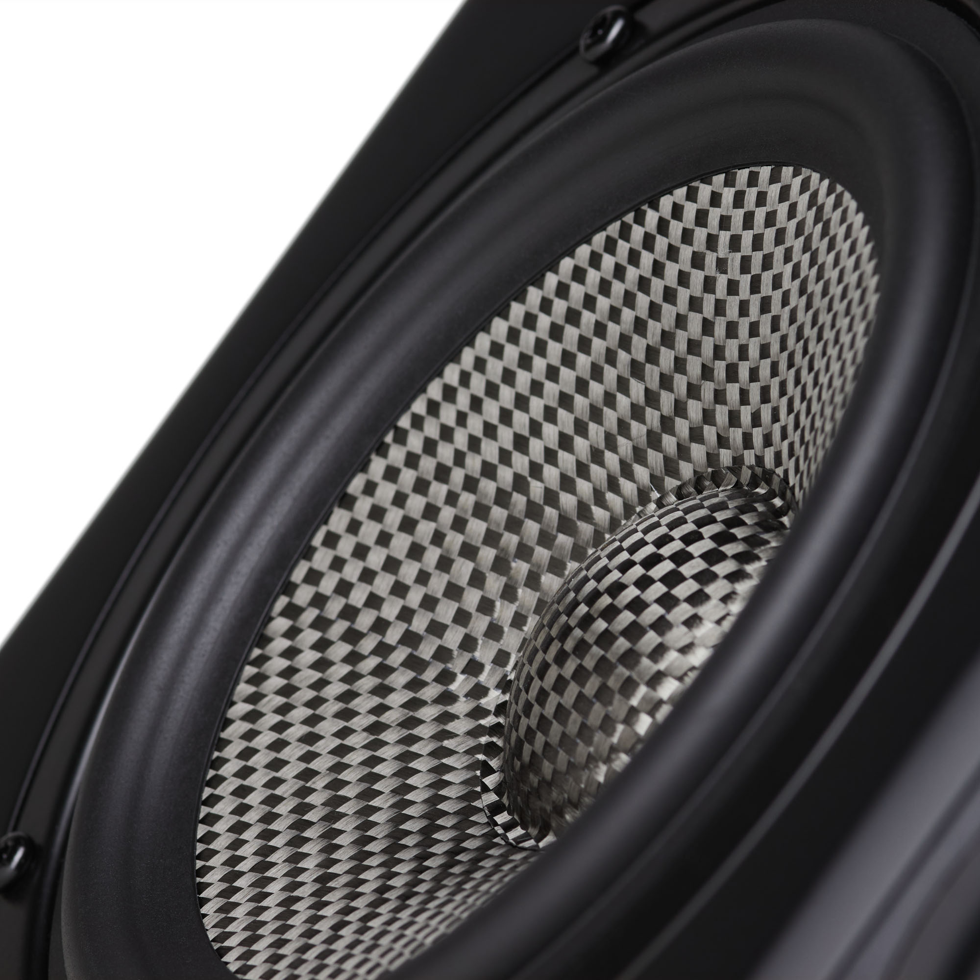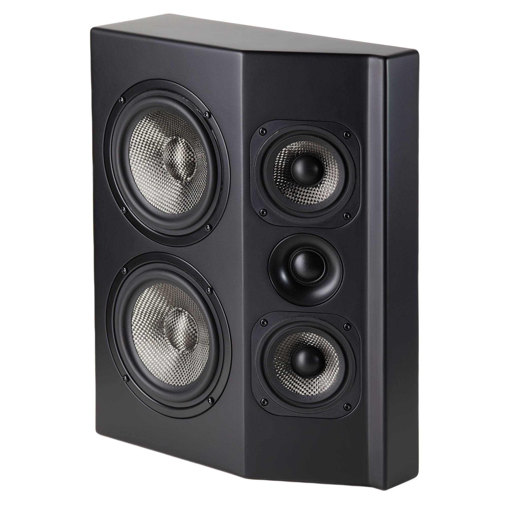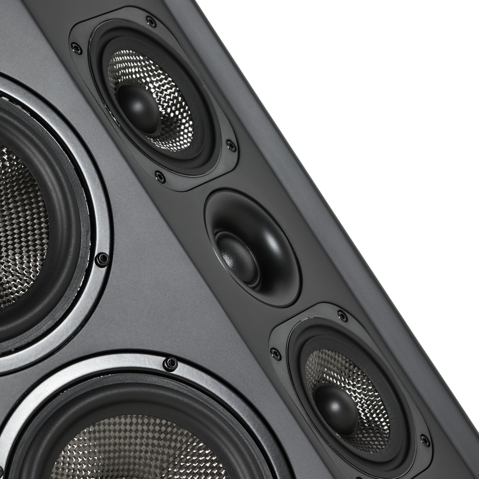 На повернутой на угол в 30 градусов поверхности расположен 25-миллиметровый ВЧ-излучатель в небольшом волноводе и два 76-миллиметровых СЧ-излучателя с диффузорами из плетеного углеволокна. Дополняет картину пара 133-миллиметровых НЧ-излучателя на передней панели.